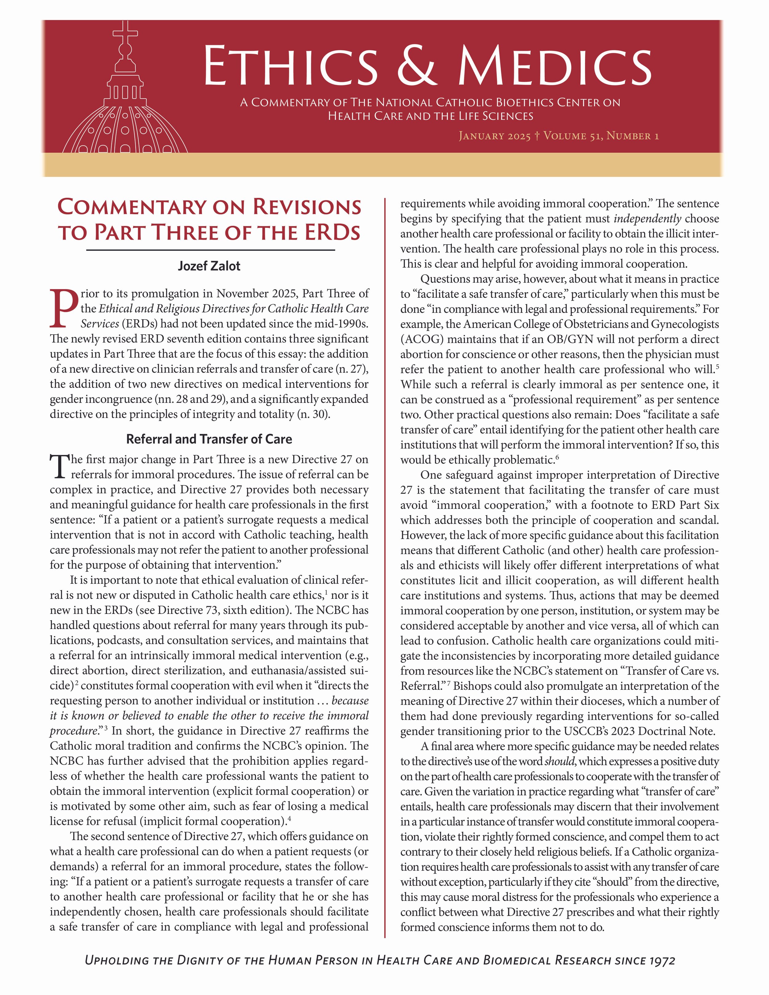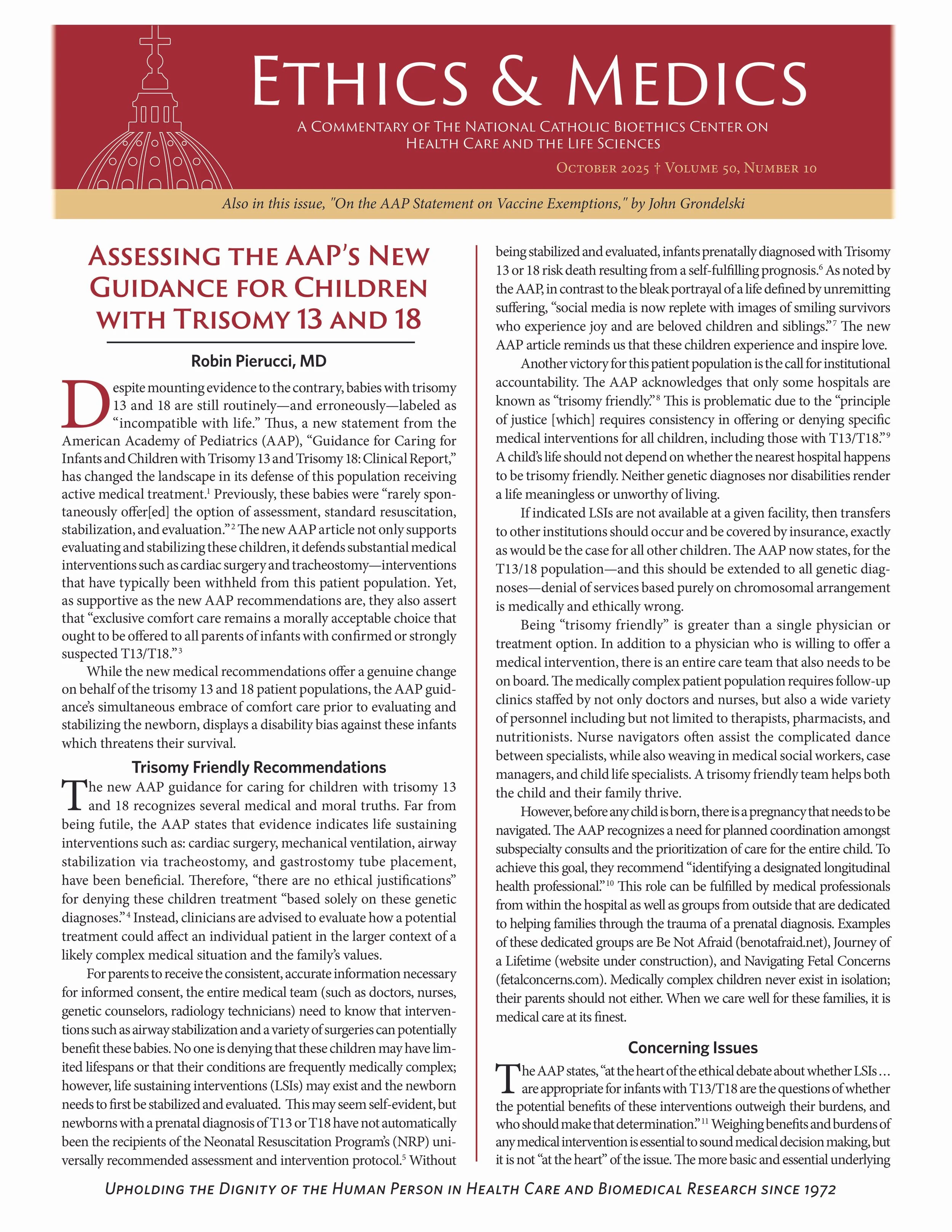 Ethics & Medics provides analysis and commentary on matters of current interest in health care, medicine, and law to help priests and religious, health professionals, students, and lay Catholics understand and appreciate the moral teaching of the Church regarding life and health.